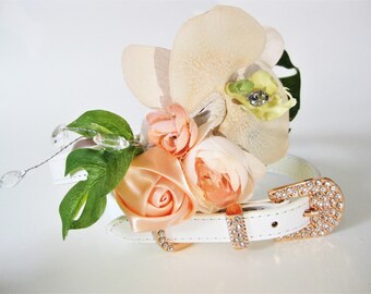 A handmade flower collar made with faux eucalyptus leaves, white baby's breath, and pink peonies was designed to be loosely tied around your dog or cat's neck (and can be worn in addition to her collar). It includes a collared "shirt" and a colorful bowtie completes the look. A pint-sized pillow ensures your four-legged ringbearer gets the ring safely down the aisle. A few also mentioned that it wasnt especially durable, so its probably best-suited for special occasions, instead of daily use. The collar is available in sizes ranging from X-small to X-large, so even gentle giants should be able to rock this collar on your big day.