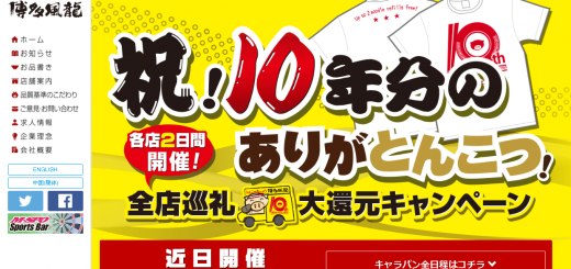 0 グルメ 2018年7月1日 by neetjapan · Published 2018年7月1日 · Last modified 2018年7月9日 とんこつラーメン 博多風龍 10周年キャンペーン 8月 8月6日(月) 8月7日(火) 大久保店 北千住店 8月20日...